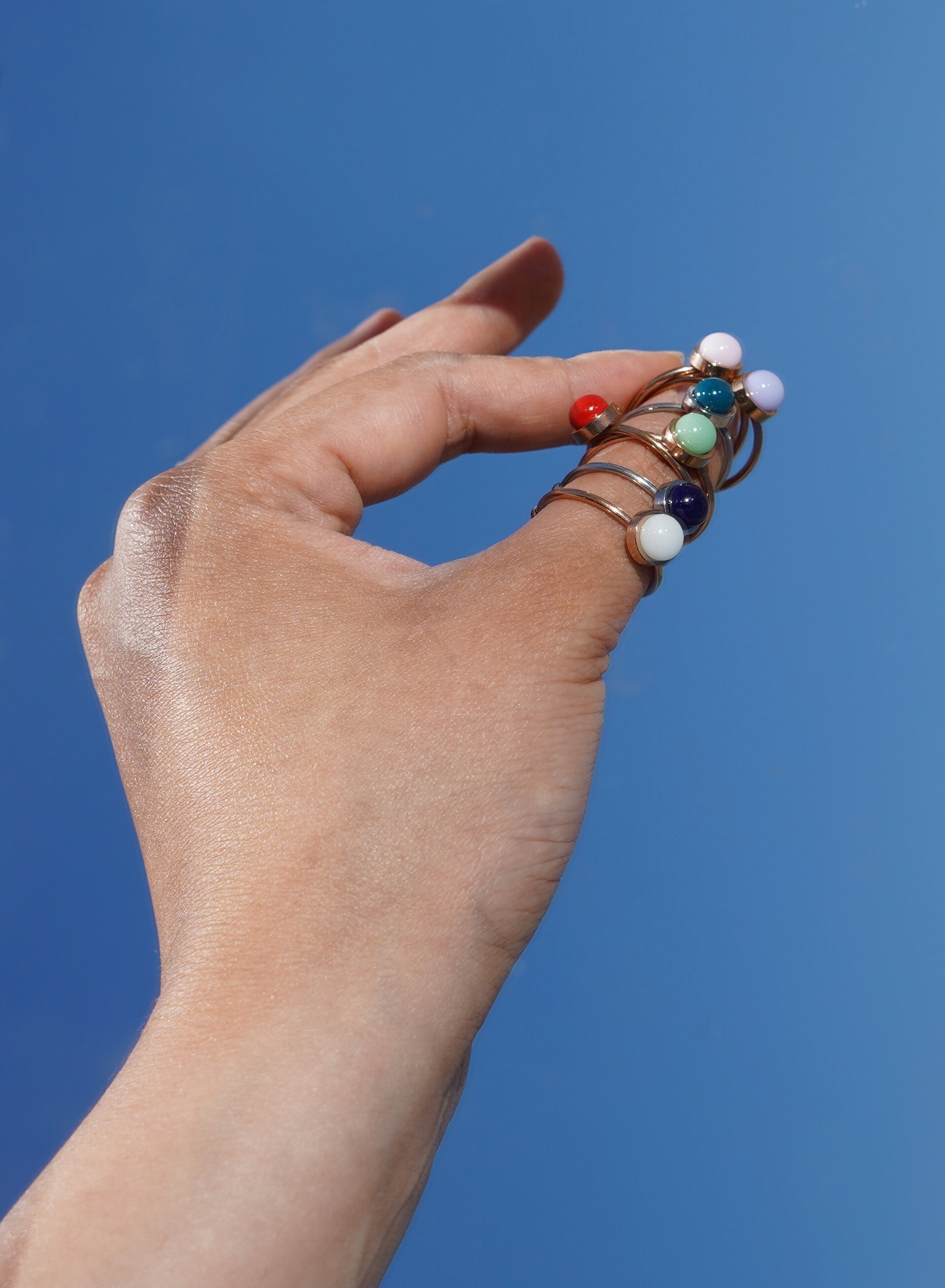 Explore our versatile handmade ceramic rings, boasting an adjustable design crafted from charming cone 10 high-temperature-fired clay, available in six delightful colors. Smaller ring measures approximately 0.2 inches in diameter and the larger ones are about 0.4 inches